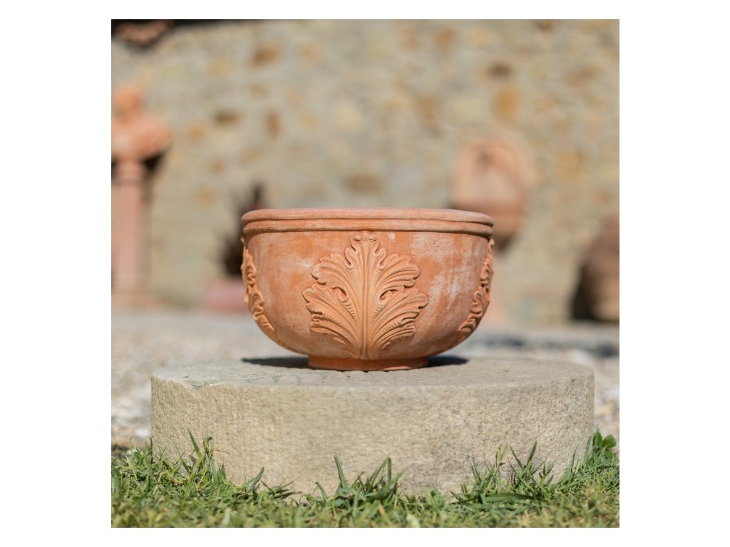 Naše terakotová mísa má malé rozměry, klasický a elegantní vzhled, po obvodu zdobená velkými zvlněnými listy, které váze dodávají téměř královský a důležitý vzhled.